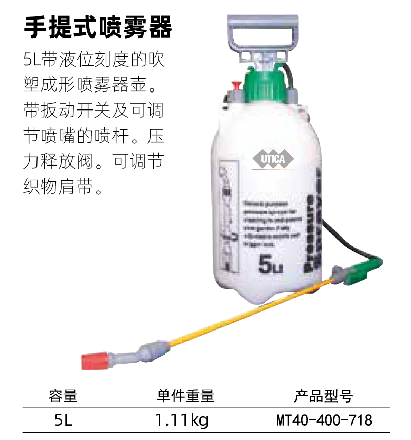 ·5L带液位刻度的吹塑成型喷雾器壶。带扳动开关及可调节喷嘴的喷杆。压力释放阀。可调节织物肩带。