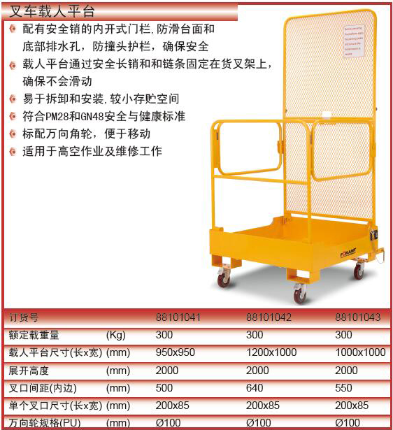 ·配有安全销的内开式门栏,防滑台面和底部排水孔,防撞头护栏,确保安全 ·载人平台通过安全长销和和链条固定在货叉架上,确保不会滑动 ·易于拆卸和安装,较小存贮空间 ·符合PM28和GN48安全与健康标准 ·标配万向角轮,便于移动