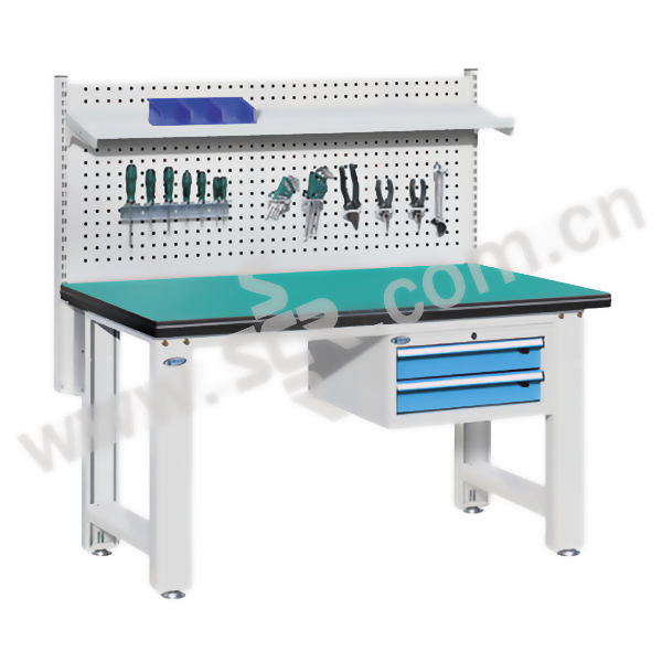 ·复合台面,承重1吨,配600高挂板+棚板一块,桌下2抽屉吊柜1×100S 1×100S,整体浅灰色,抽屉蓝色