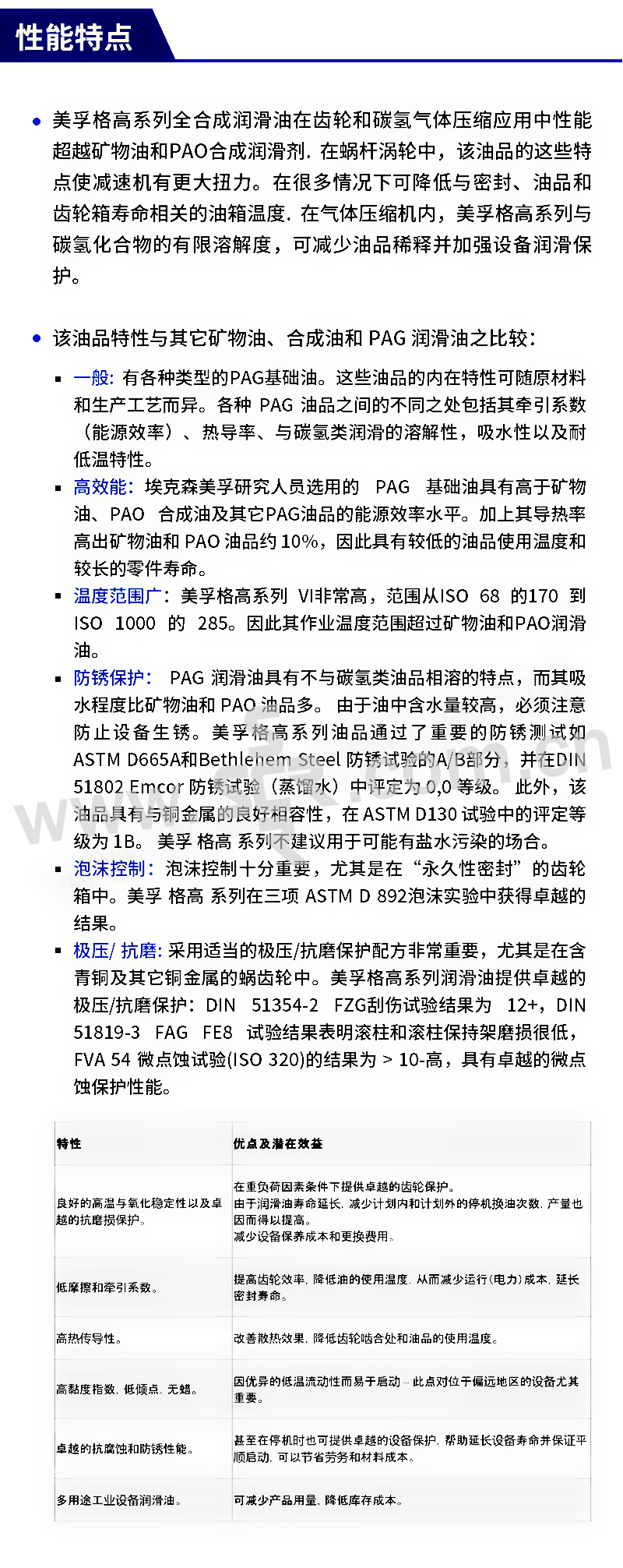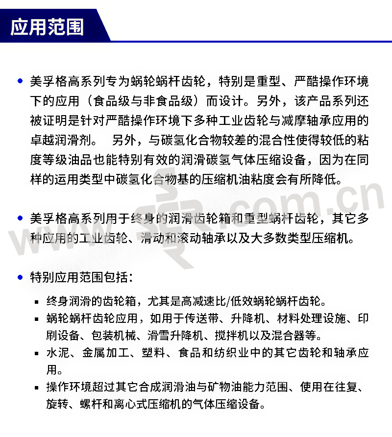 ·高水平微点蚀保护。 ·优异的防锈和防腐蚀保护。 ·优良的抗泡性能:有效防止泡沫产生并具有低牵引系数。