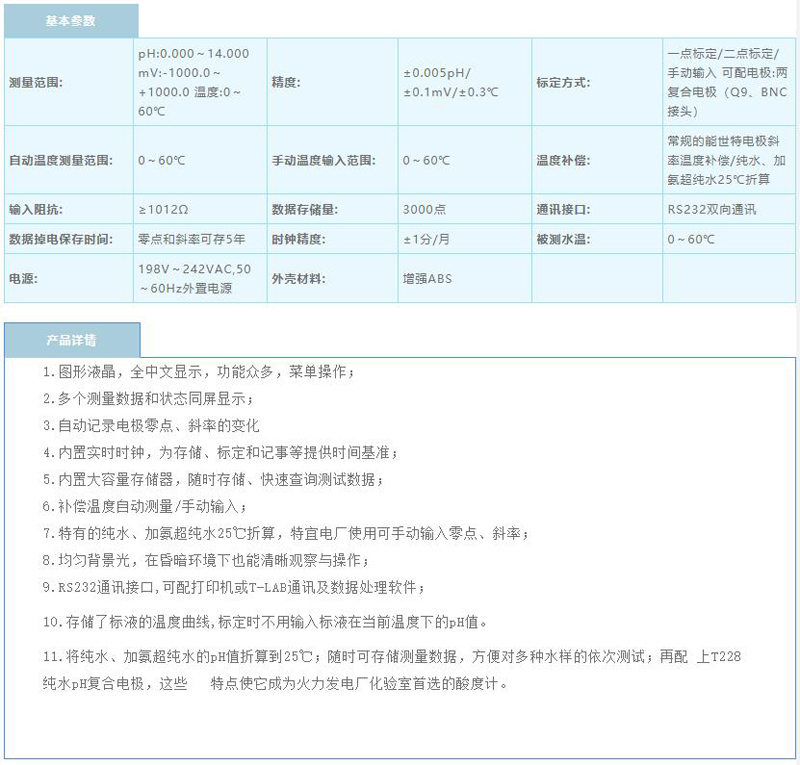 ·图形液晶,全中文显示,功能众多,菜单操作 ·多个测量数据和状态同屏显示 ·自动记录电极零点、斜率的变化 ·内置大容量存储器,随时存储、快速查询测试数据