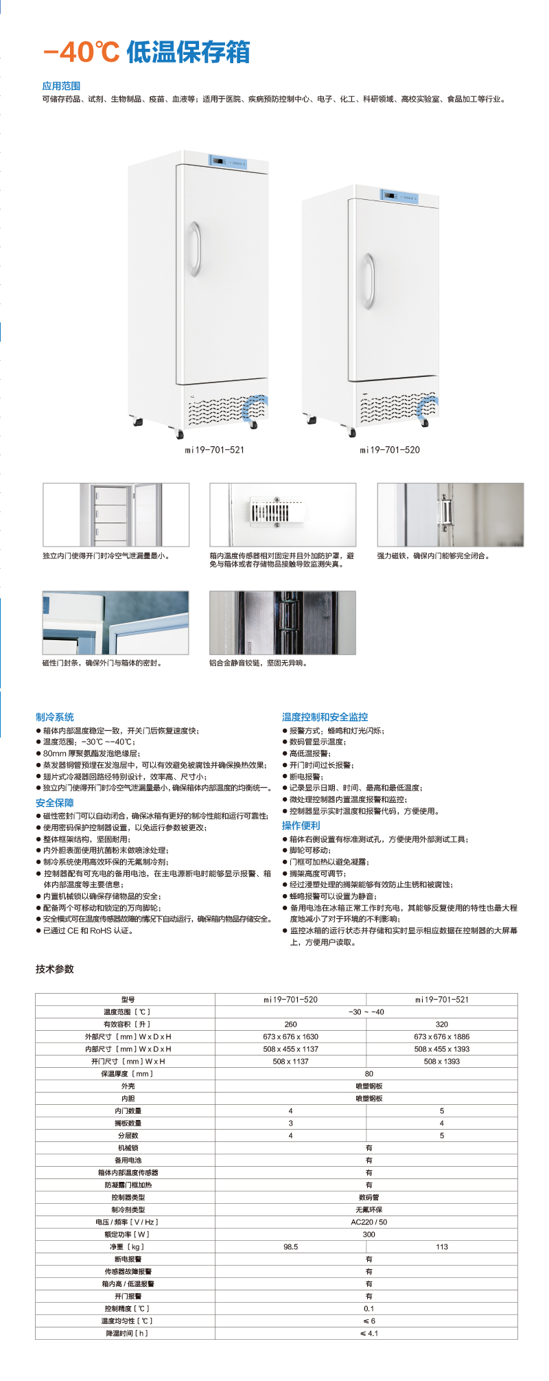 ·制冷系统: 箱体内部温度稳定一致,开关门后恢复速度快;温度范围:-30℃ ~-40℃; 80mm厚聚氨酯发泡绝缘层; 蒸发器铜管预埋在发泡层中,可以有效避免被腐蚀并确保换热效果;翅片式冷凝器回路经特别设计,效率高、尺寸小; 独立内门使得开门时冷空气泄漏量最小,确保箱体内部温度的均衡统一。 ·温度控制和安全监控: 报警方式:蜂呜和灯光闪烁;数码管显示温度; 高低温报警; 开门时间过长报警;断电报警; 记录显示日期、时间、最高和最低温度;微处理控制器内置温度报警和监控; 控制器显示实时温度和报警代码,方便使