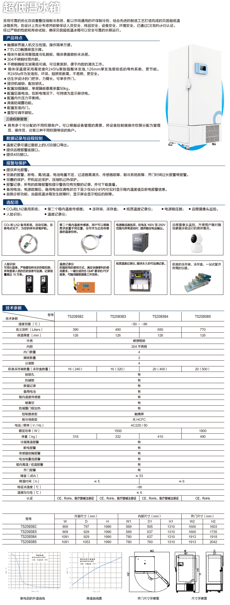 ·触摸屏界面人机交互性强,操作简单方便 ·7寸LCD触摸屏显示器 ·箱体外部采用高强度冷轧钢板,箱体表面做粉末涂层 ·304不锈钢材质内胆 ·不锈钢搁板支架高低可调,可任意装卸,便于内腔的清洗工作 ·箱体保温层采用高密度R245fa聚胺脂整体发泡,126mm厚发泡层极低的导热系数,更节能。R245fa作为发泡剂,环保,阻燃系数高,不易燃,更安全