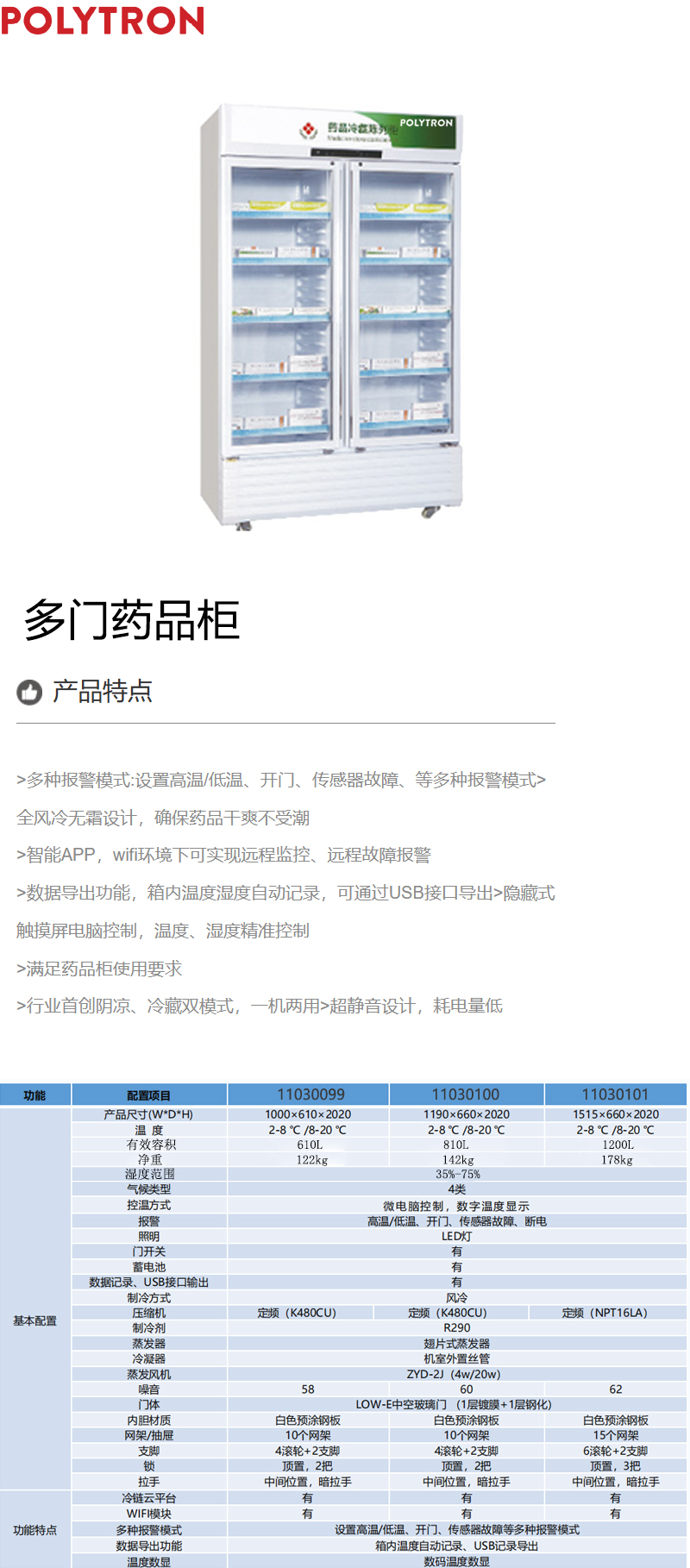 ·有冷链云平台; ·有WIFI模块; ·多种报警模式:设置高温/低温、开门、传感器故障等多种报警模式; ·数据导出功能:箱内温度自动记录、USB记录导出; ·温度数显:数码温度数显.