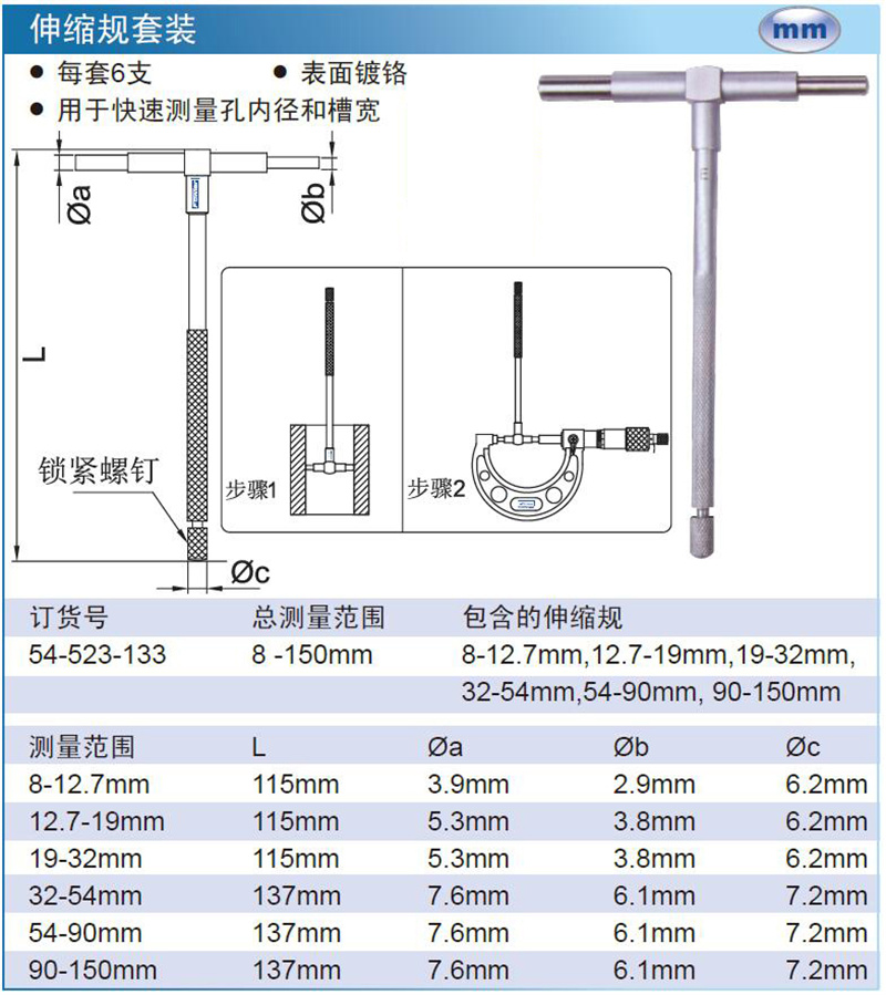 ·每套6支 ·表面镀铬 ·用于快速测量孔内径和槽宽