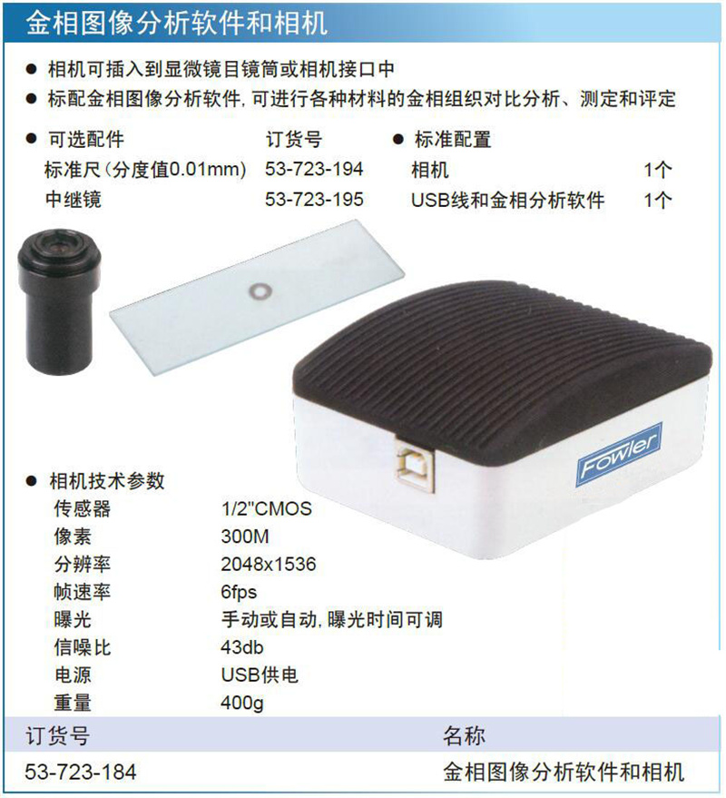 ·相机可插入到显微镜目镜筒或相机接口中 ·标配金相图像分析软件,可进行各种材料的金相组织对比分析、测定和评定 ·可选配件 订货号 标准尺分度值0.01mm 53-723-194 中继镜 53-723-195 ·标准配置 相机 1个 USB线和金相分析软件 1个