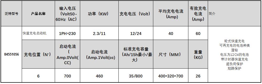 订货号 制造商型号 型号 输入电压 输出电压 电池类型 功率 充电电压 平均充电电流 Amp 有效充电电流 Amp 充电位置 启动电流 启动电流 标准充电容量 Ah/15h最小/最大 尺寸 重量 价格 购物车