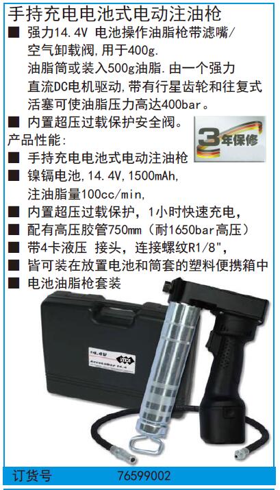 ·强力14.4V电池操作油脂枪带滤嘴 ·空气卸载阀,用于400g. ·油脂筒或装入500g油脂.由一个强力 ·直流DC电机驱动,带有行星齿轮和往复式 ·活塞可使油脂压力高达400bar。 ·内置超压过载保护安全阀。 产品性能: ·手持充电电池式电动注油枪 ·镍镉电池,14.4V,1500mAh, 注油脂量100cc/min, ·内置超压过载保护,1小时快速充电, ·配有高压胶管750mm(耐1650bar高压) ·带4卡液压接头,连接螺纹R1/8", ·皆可装在放置电池和筒套的塑料便携箱中 ·电池油脂枪套