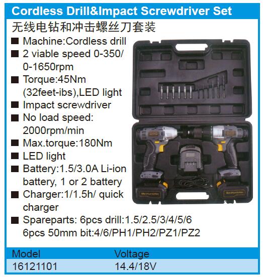 螺丝刀套装 冲击螺丝刀 空载速度: 2000RPM/分钟 最大扭矩:180N·m LED灯 电池:1.5/3.0A锂离子 电池,1或2电池 充电器:1/1.5h/快速 6个钻头:1.5/2.5/3/4/5/6 6个50毫米钻头:4/6/PH1/PH2/PZ1/PZ2