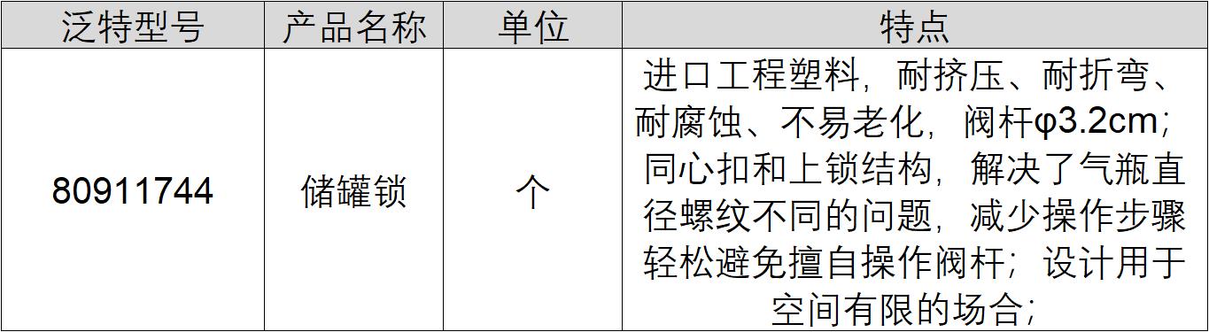 ·进口工程塑料,耐挤压、耐折弯、耐腐蚀、不易老化,阀杆φ3.2cm; ·同心扣和上锁结构,解决了气瓶直径螺纹不同的问题,减少操作步骤轻松避免擅自操作阀杆;