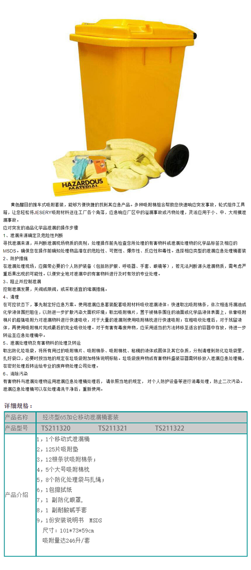·泄漏应急处理桶里包含相应的泄漏应急处理材料,分成吸油专用(油和碳氢化合物液体)、通用型(油、水和化学物质)和化学吸液型(化学品,腐蚀性液体和危险 化学品)。条状、片状吸附棉按一定比例组合,加上超强吸附剂,再配备上相应的防护产品,使应对突发之泄漏更迅速有效