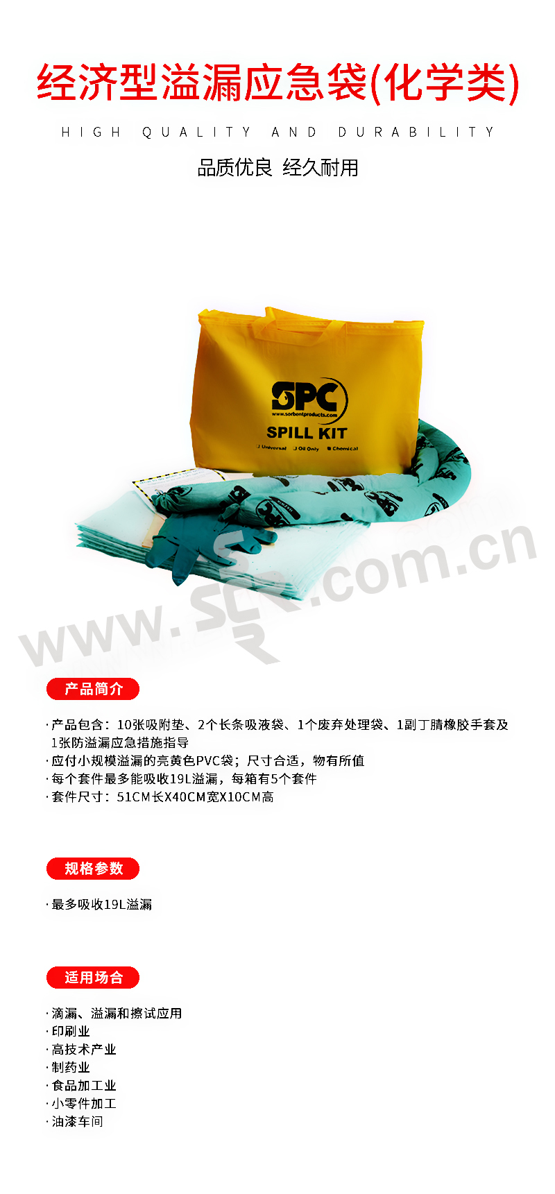 ·产品包含:10张吸附垫、2个长条吸液袋、1个废弃处理袋、1副丁腈橡胶手套及1张防溢漏应急措施指导·应付小规模溢漏的亮黄色PVC袋;尺寸合适,物有所值·每个套件最多能吸收19L溢漏,每箱有5个套件·套件尺寸:51cm长x40cm宽x10cm高