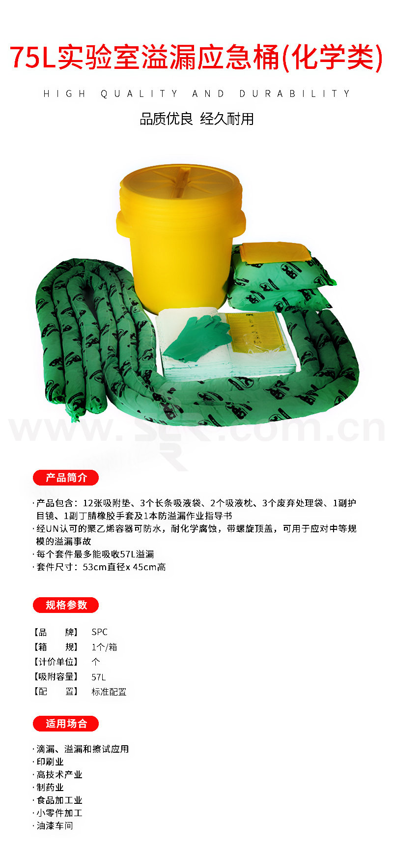 ·产品包含:12张吸附垫、3个长条吸液袋、2个吸液枕、3个废弃处理袋、1副护目镜、1副丁腈橡胶手套及1本防溢漏作业指导书·经UN认可的聚乙烯容器可防水,耐化学腐蚀,带螺旋顶盖,可用于应对中等规模的溢漏事故·每个套件最多能吸收57L溢漏·套件尺寸:53cm直径x 45cm高