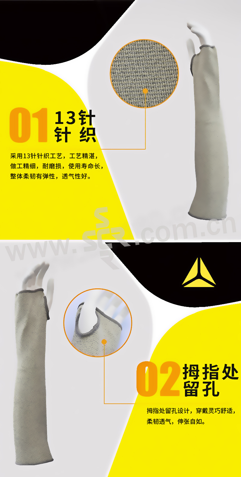 ·耐热芳纶纤维针织防切割套袖·13针,拇指处留孔,长45cm,合理平和抗切割性能与灵巧性,有效保护整个手臂·短时耐热接触100°C,并通过食品安全认证·可单只出售,不分左右手·适用于模具加工冲压操作,装配装饰,食品包装等行业