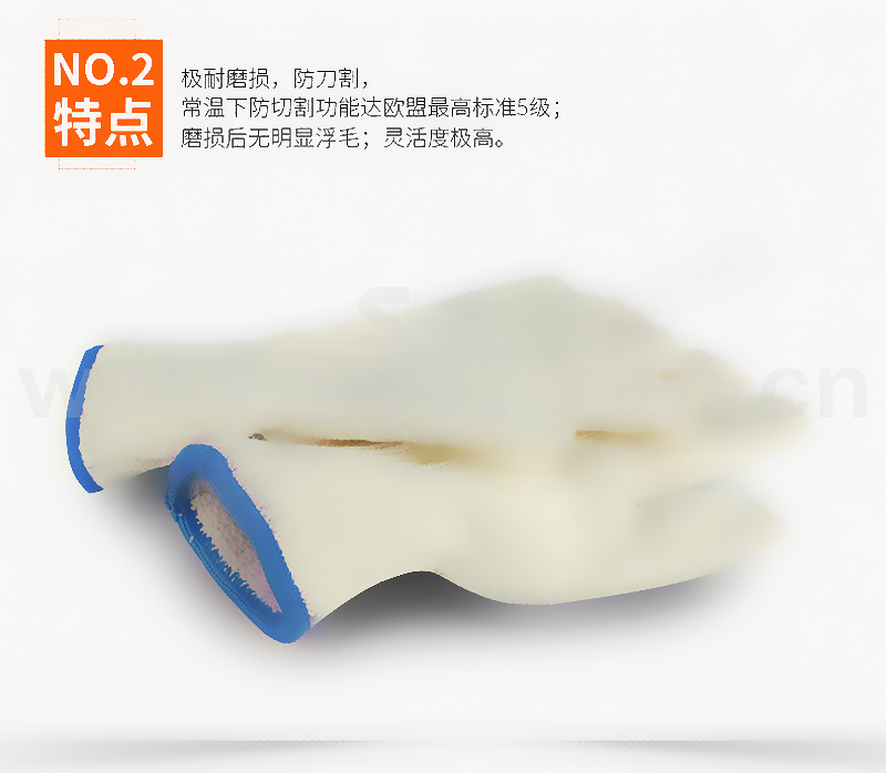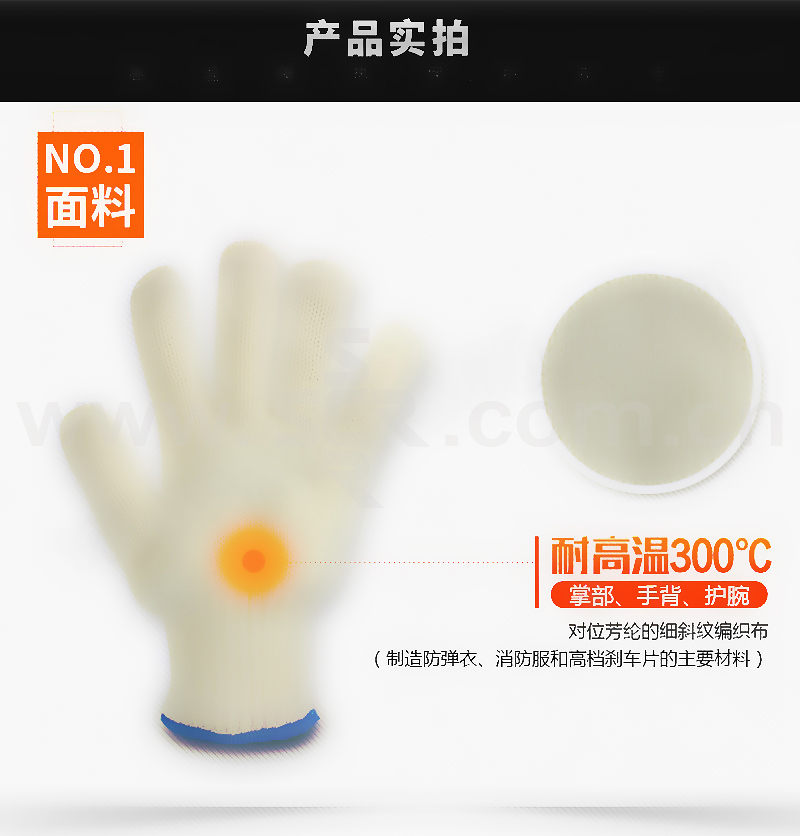 ·主要面料为间位芳纶(Meta Aramid)弹性针织布,耐温300℃,持续时间15-20秒,防割且耐磨,手型舒适灵活