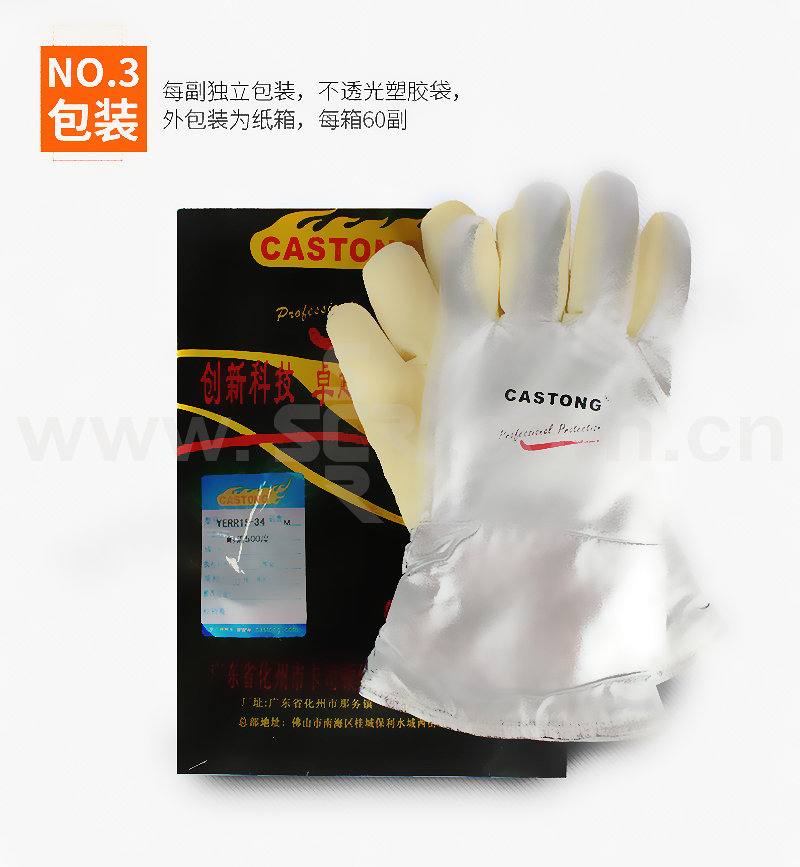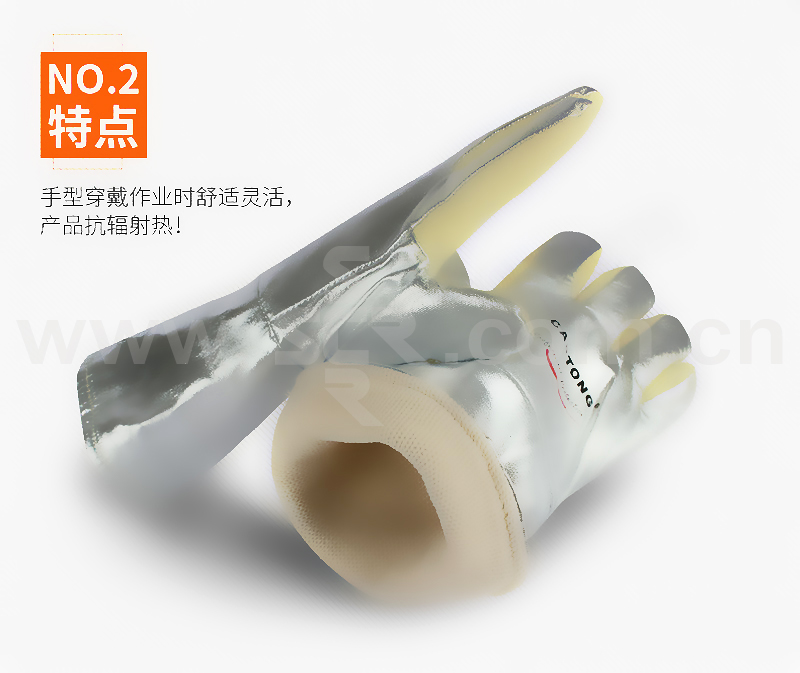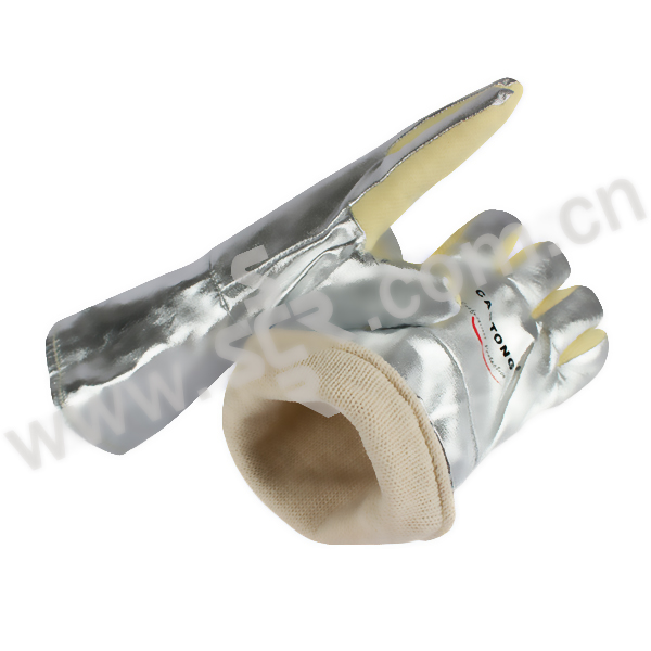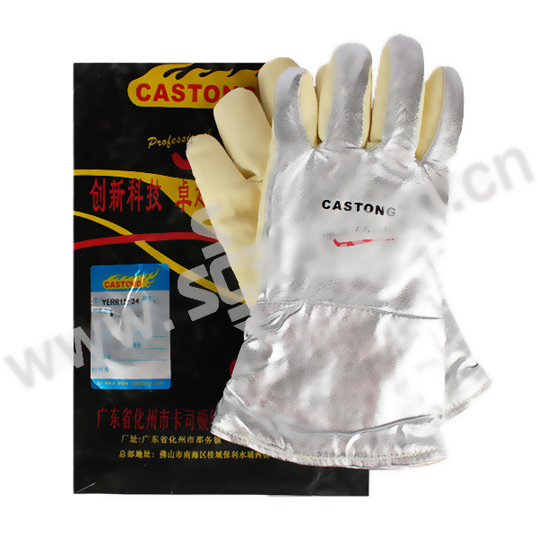 ·耐500°高温·长度:34CM·颜色:土黄色·灵活度:3级·主要面料为对位芳纶(Meta Aramid)密织毡,耐温500℃,每次持续时间15-20秒,有一定的防割和耐磨性能,磨损后有少量浮毛,手型舒适灵活·背部及腕部主要面料为棉帆布复合铝箔,防辐射热,抗撕裂和褶皱,耐温500℃辐射热,每次持续时间10-15秒·表面光滑,能有效防止金属火星飞溅和热辐射