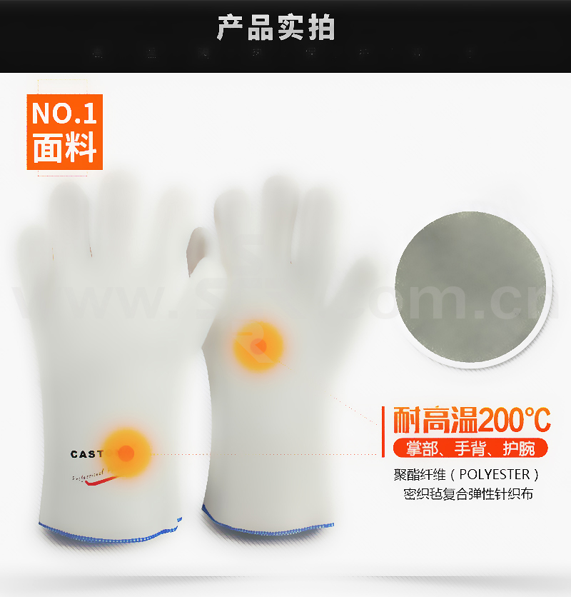 ·耐温200℃·长度:33cm,掌宽 12cm·颜色:米白色·灵活度:5级·PKKK系列采用聚酯纤维密织毯复合弹性织布,抗撕裂,灵活舒适,仿生学原理设计手型,与手指特别贴合,美观大方,且使用起来十分舒适