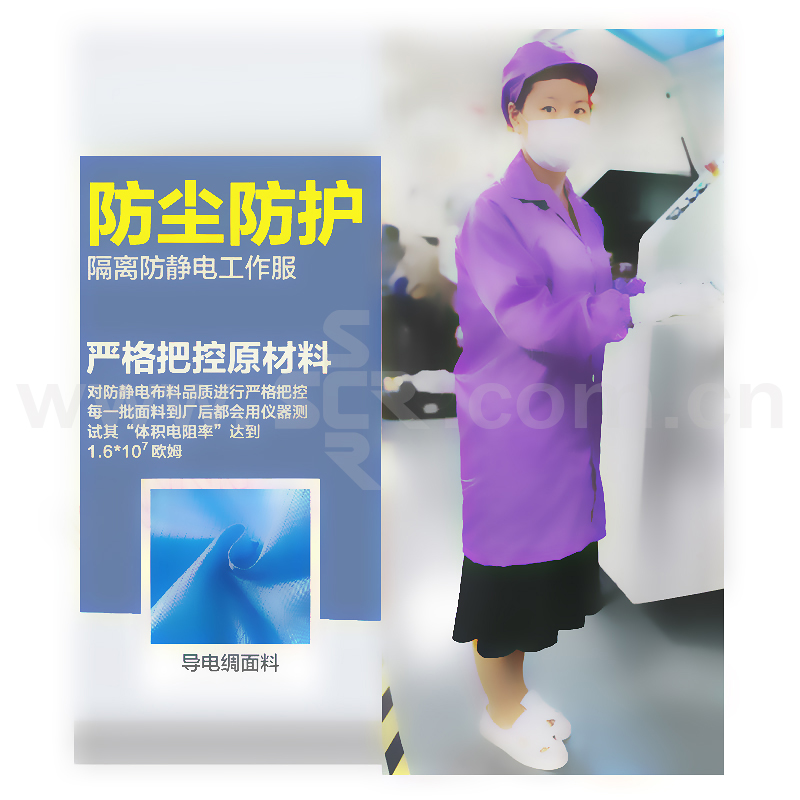 ·防静电无尘服面料本身不发尘、不粘尘、阻隔性好、高密度、高强度