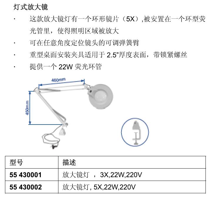 ·这款放大镜灯有一个环形镜片(5X) ,被安置在一个环型荧 ·光管里,使得照明区域被放大 ·可在任意角度定位镜头的可调弹簧臂 ·重型桌面安装夹具适用于2·5"厚度表面,带锁紧螺丝 ·提供一个22W荧光环管