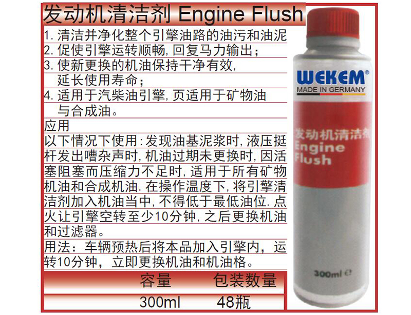 ·清洁并净化整个引擎油路的油污和油泥 ·促使引擎运转顺畅,回复马力输出; ·使新更换的机油保持干净有效,延长使用寿命; ·适用于汽柴油引擎,页适用于矿物油与合成油。 ·用法:车辆预热后将本品加入引擎内,运转10分钟,立即更换机油和机油格。