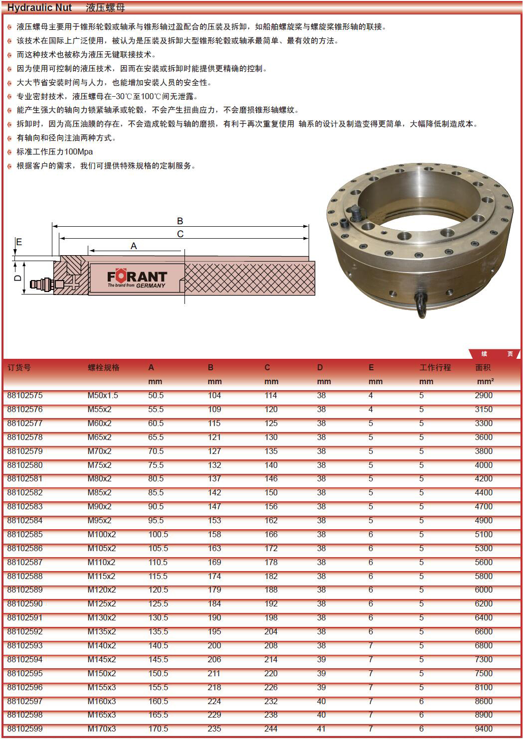 ·该技术在国际上广泛使用,被认为是压装及拆卸大型锥形轮毂或轴承最简单、最有效的方法。而这种技术也被称为液压无键联接技术。 ·因为使用可控制的液压技术,因而在安装或拆卸时能提供更精确的控制。 ·大大节省安装时间与人力,也能增加安装人员的安全性。 ·专业密封技术,液压螺母在-30℃至100℃间无泄露。 ·能产生强大的轴向力锁紧轴承或轮毂,不会产生扭曲应力,不会磨损锥形轴螺纹。 ·拆卸时,因为高压油膜的存在,不会造成轮毂与轴的磨损,有利于再次重复使用轴系的设计及制造变得更简单,大幅降低制造成本。 ·有轴向和径向