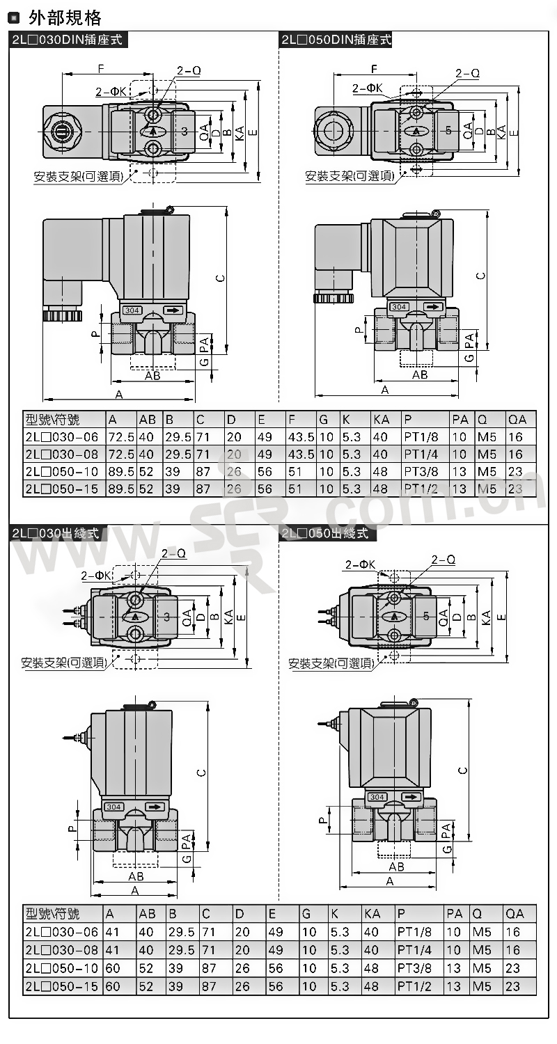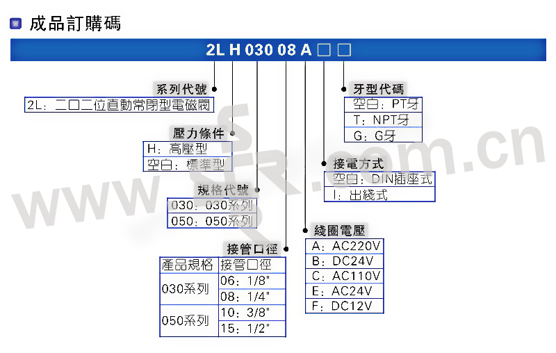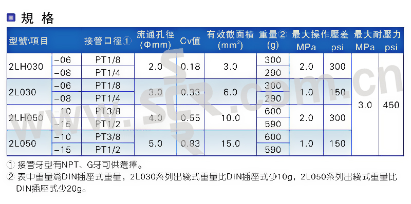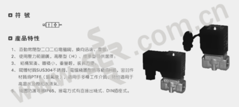 ·直动常闭型二口二位电磁阀,换向迅速、灵敏·使用压力范围广,高压型(H)、标准型可供选择·结构紧凑、体积小、重量轻、装拆方便·阀体材质SUS304不锈钢,电磁线圈耐热等级为H级,密封件材质为PTFE(铁氟龙),适用于多种工作介质,特别适用于高温水及饱和水蒸气·线圈防护等级IP65,接电方式有直接出线式、DIN插座式
