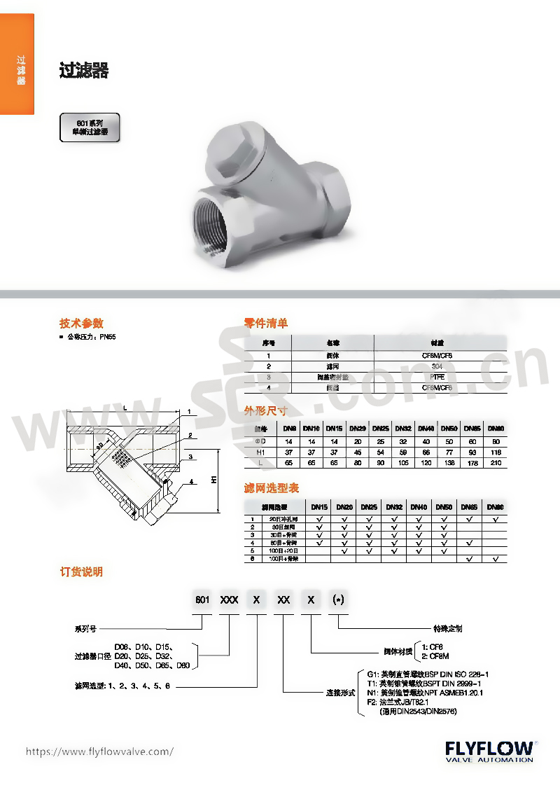 FLYFLOW/福莱福流 单帽Y型过滤器 601D151G1 DN15 内螺纹接口 CF8不锈钢阀体 目数20 1个