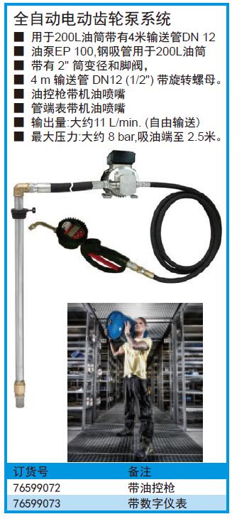 ·用于200L油筒带有4米输送管DN12 ·油泵EP100,钢吸管用于200L油筒 ·带有2"筒变径和脚阀, ·4m输送管DN12(1/2")带旋转螺母。 ·油控枪带机油喷嘴 ·管端表带机油喷嘴 ·输出量:大约11L/min.(自由输送) ·最大压力:大约8bar,吸油端至2.5米。