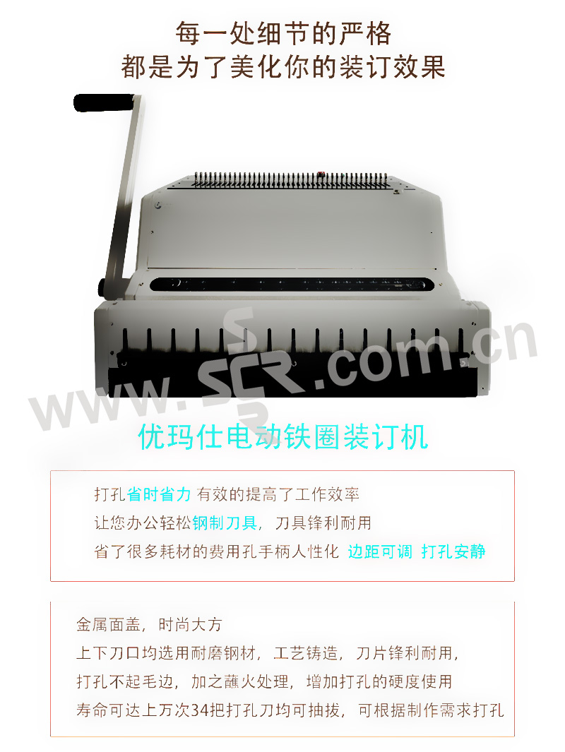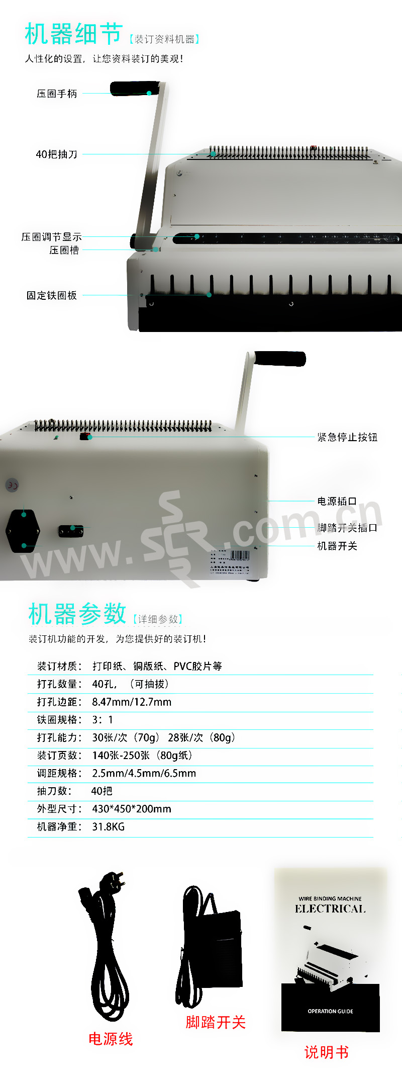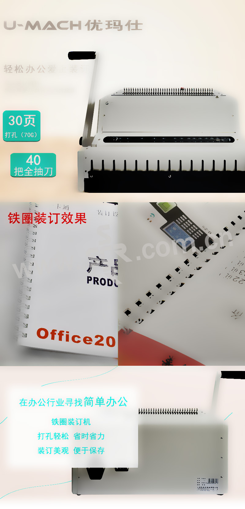·将装订机放置于可靠的工作台上。·将压环手柄装入右侧的主轴上,再将手柄旋钮拧入主轴上·将脚踏开关插头插入脚踏开关插孔。·将机器插头擂入电源插孔内。将电源开关拔至1,开关内的灯亮。·按启动开关或踩动脚踏开关机器会进行打孔工作。·将去油纸从打孔入口推入进行多次打孔除掉刀具上的油渍。边距调节:左右拉动调距器可以调节打孔的边距位置调节:拧松调位器旋钮推动调位器。配合标尺和抽出抽刀块,可以打各种规格的纸张。打孔·根据纸张的规格