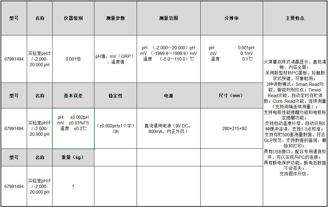 B17533 67991494 pH(-2.000~20.000)pH mV(-1999.9~1999.9)mV 温度(-5.0~110.0)℃ pH0.001pH mV0.1mV 温度0.1℃ 0.001级 pH值、mV(ORP)、温度值 pH±0.002pH mV±0.03%FS 温度±0.2℃ (±0.002pH±1个字)/3h 直流通用电源(9VDC,800mA,内正外负) 280×215×92mm 1Kg 20992.88