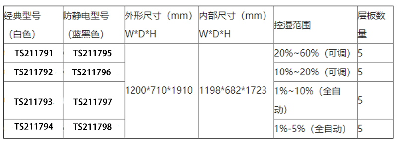 规格:  防静电型容积1436L(四门)控制范围(RH)1%~3%(全自动) 制造商型号:  TS211798
